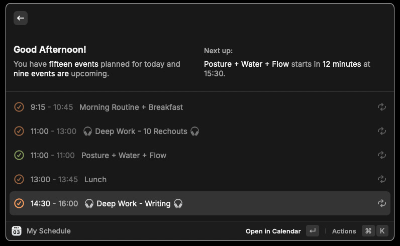 My Schedule: Raycast connects to my calendar and gives me a quick rundown of my events.